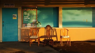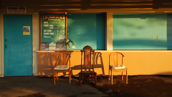 The end of a long summer day in Vancouver with three chairs enjoying the sunset. Vancouver, British Columbia, Canada.
